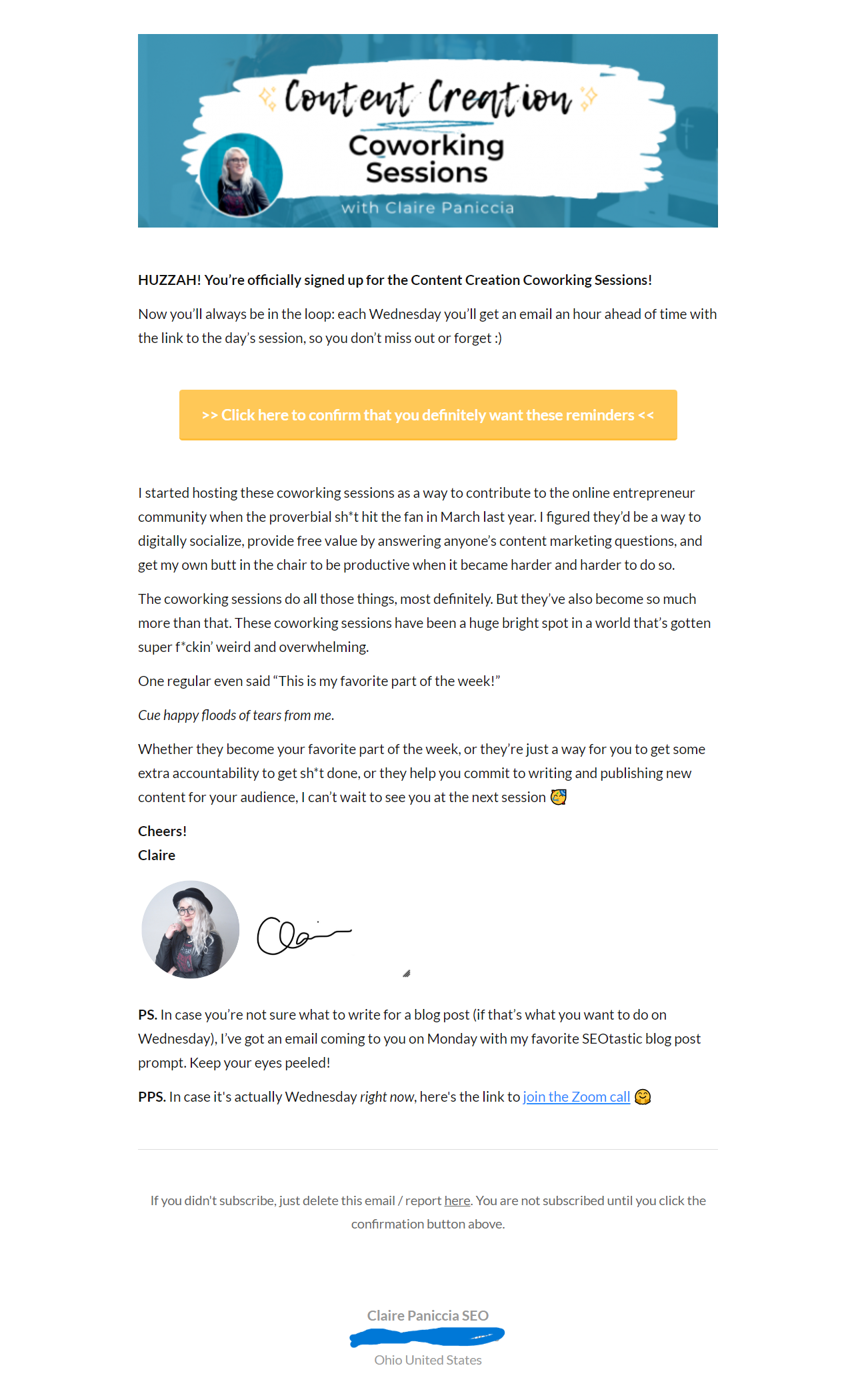 • The confirmation button (they have to click this, or they won't be added to your list and won't get the reminder emails)