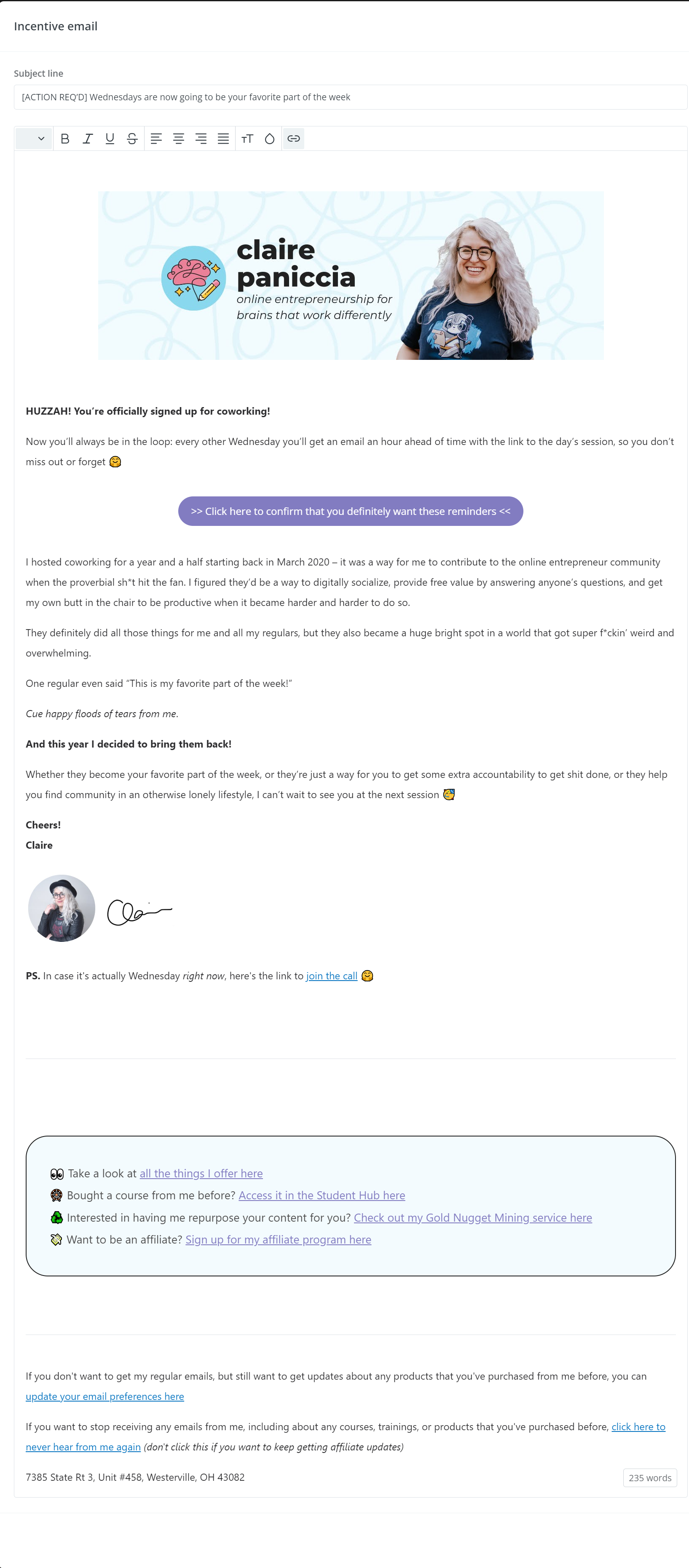 • The link to join the coworking call in case they signed up on the same day as coworking with the hope to join'